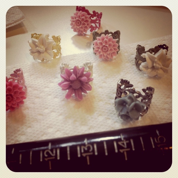 For the past few days I have been making rings and earring in preparation for the summer market and to currently list on etsy. I have so much fun making these rings and earring because of the variety of colors and shapes of the flower cabochons.